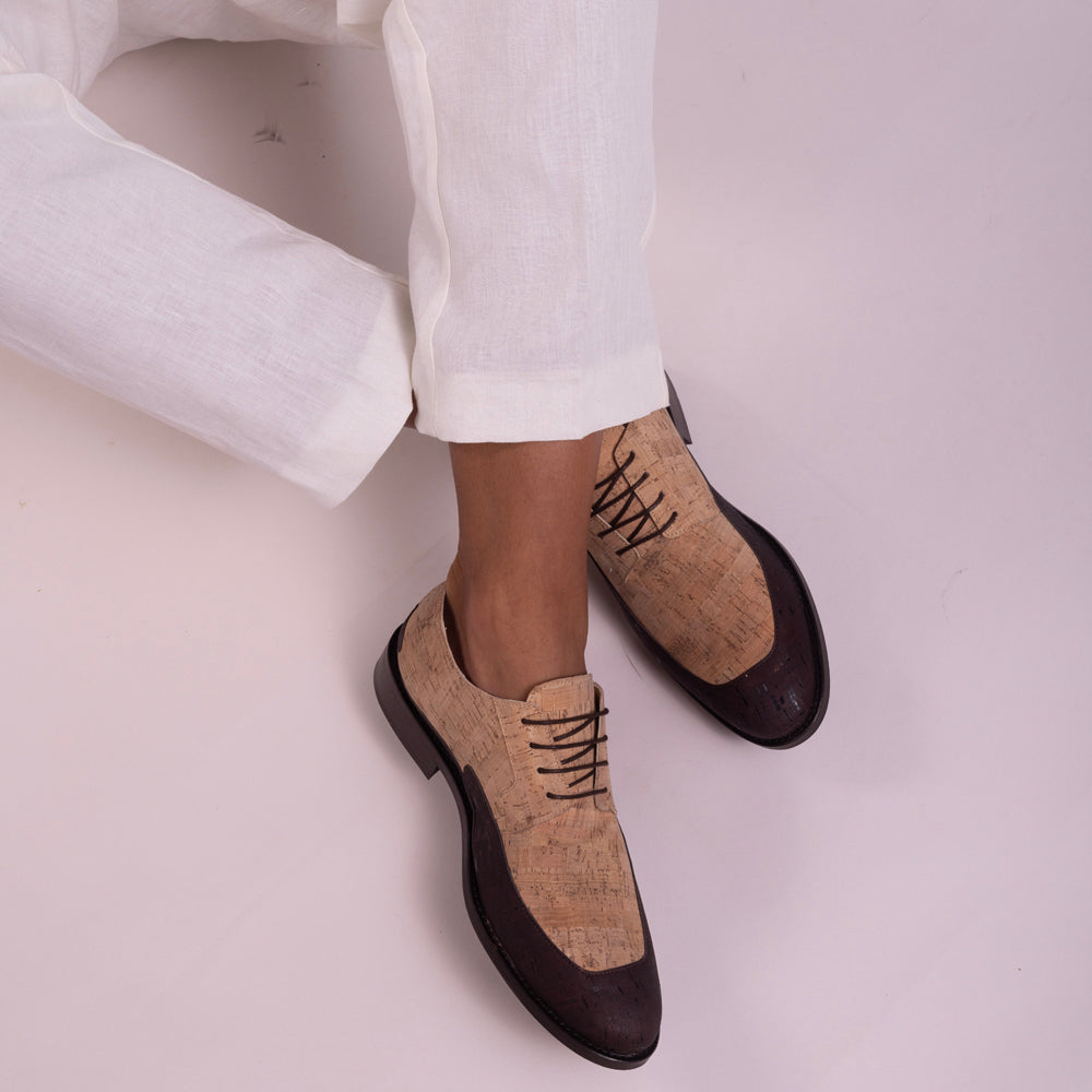 Entdecke unseren eleganten Herren-Derby-Schuh, sorgfältig gefertigt aus nachhaltigen Korkmaterialien für eine zeitlose Eleganz. Umarmt die Schönheit der Natur mit den natürlichen und schokoladenfarbenen Korkakzenten, die jedem Schritt einen Hauch von Raffinesse verleihen.